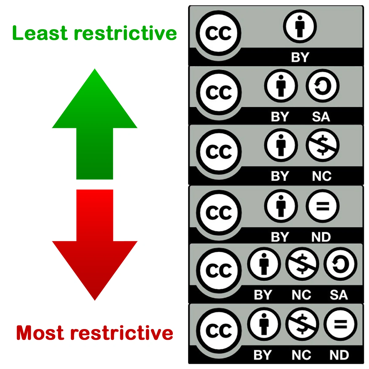 Creative Commons has established a set of licenses that make it possible to share content legally and openly. There a 6 types of CC licenses, combined out of 4 license elements, from very permissive to more restrictive.